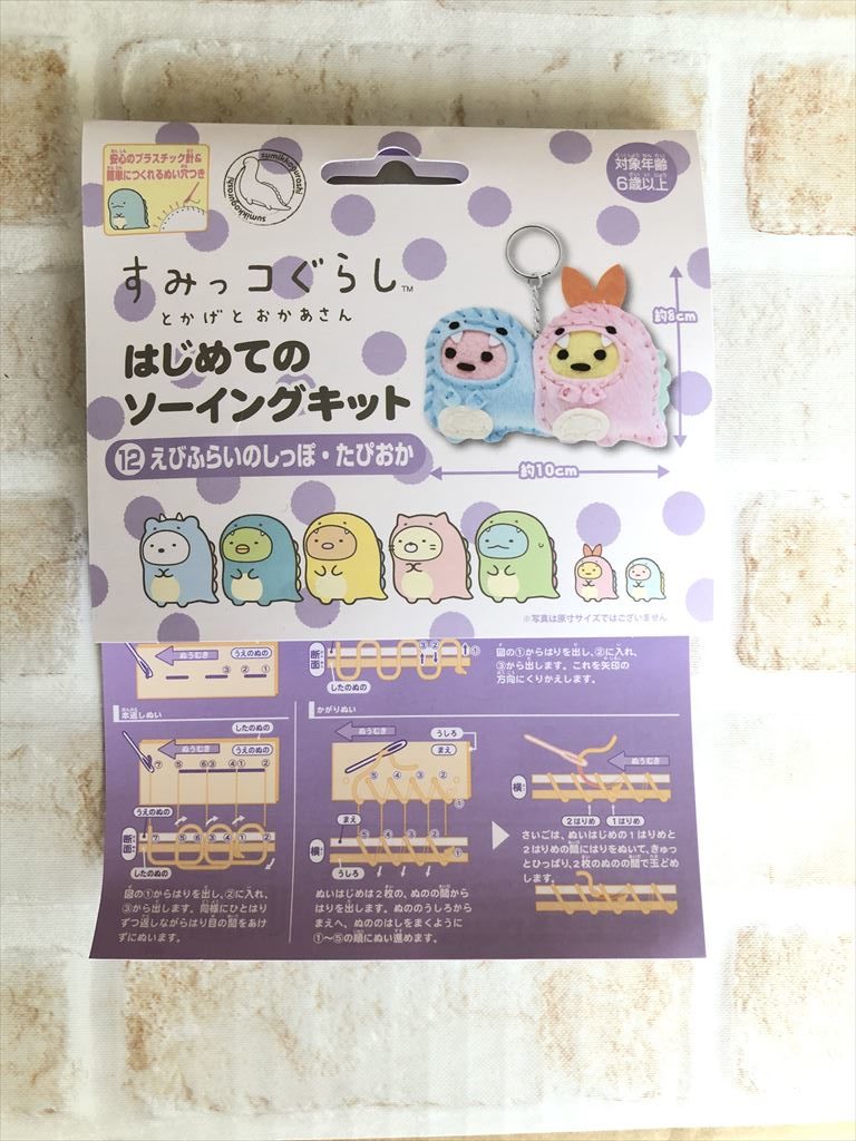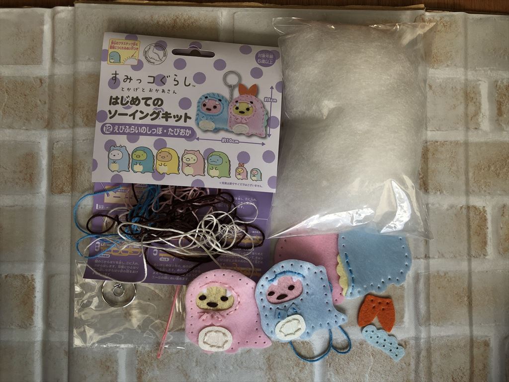 「はじめてのソーイングキット すみっコぐらし」は、大体500円くらいで購入することができます。ファンシーショップで売られているマスコットよりも安いですよね。作る工程も楽しめて、完成後はキーボルダーやチャームとしても使えます。実際に出来上がるととっても可愛くて、娘も大喜びでした。